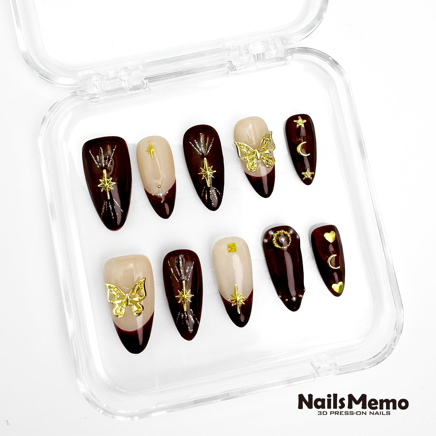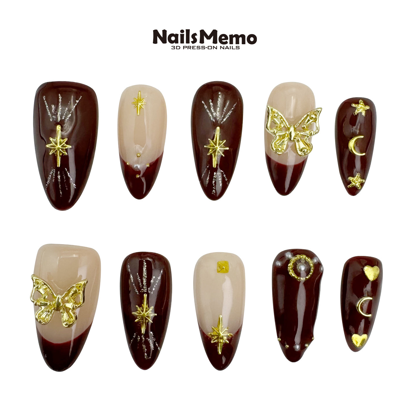 A mystical amber-inspired design blending rich, deep burgundy hues and translucent neutrals accented with delicate golden celestial charms—stars, moons, and butterflies—evoking an enchanted twilight. Shimmering silver lines and subtle pearl embellishments add whispers of elegance, capturing reflections of distant constellations.