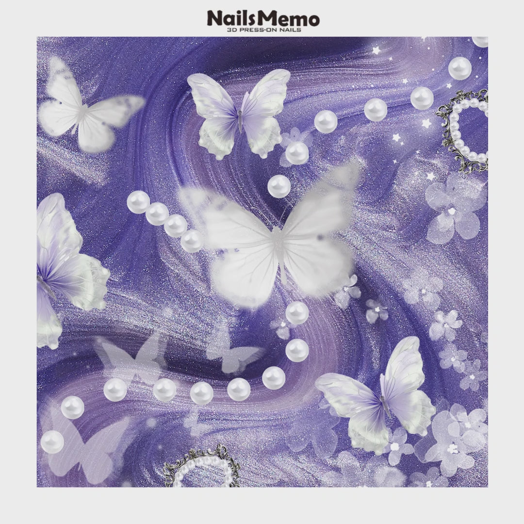 A dreamy, butterfly-inspired design blending soft lavender hues, icy silvers, and delicate whites. Scattered pearls glimmer like distant starlight, while intricate silver engravings and ethereal butterfly wings evoke a serene vision caught between reality and fantasy.