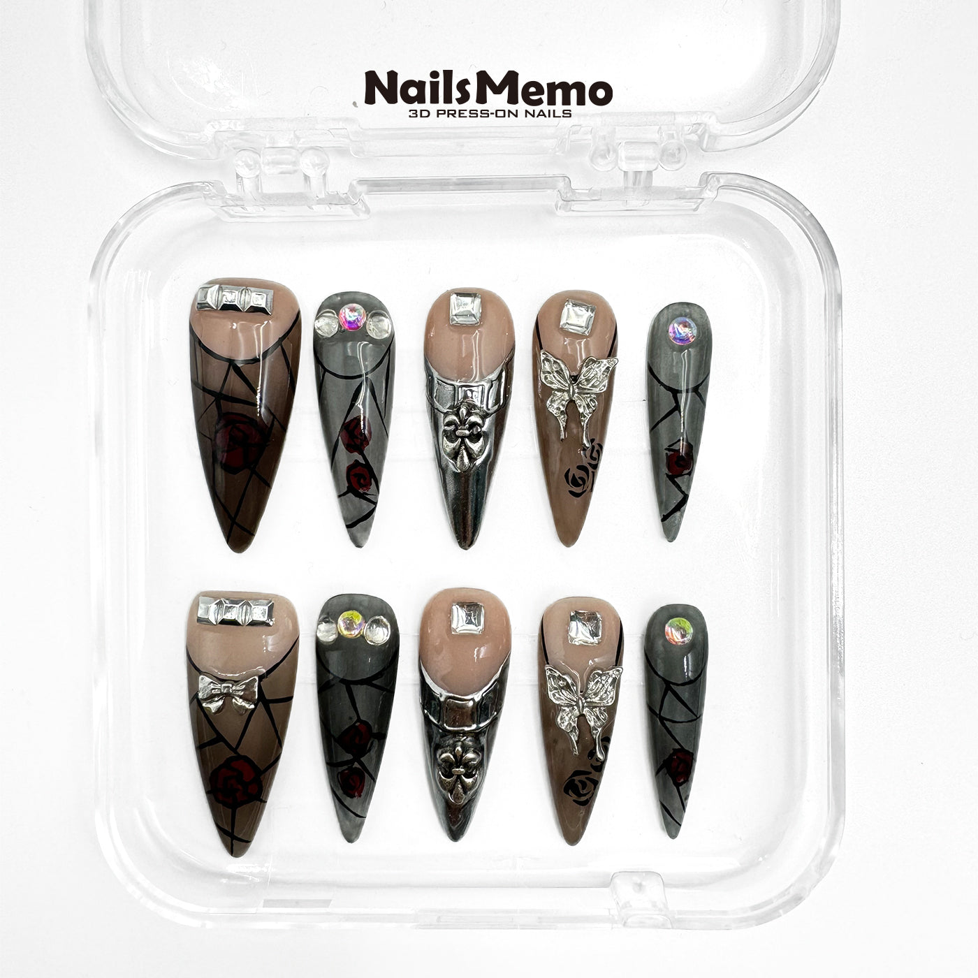 A symphony of mystery and elegance, Nocturne Charm is a press-on nail set that embraces deep mocha tones, onyx-black webbed overlays, and silver metallic accents. The design features ornate fleur-de-lis charms, gothic butterflies, and soft geometric lines—all coming together like a midnight sonata. This set channels bold sophistication with a dark romantic twist.