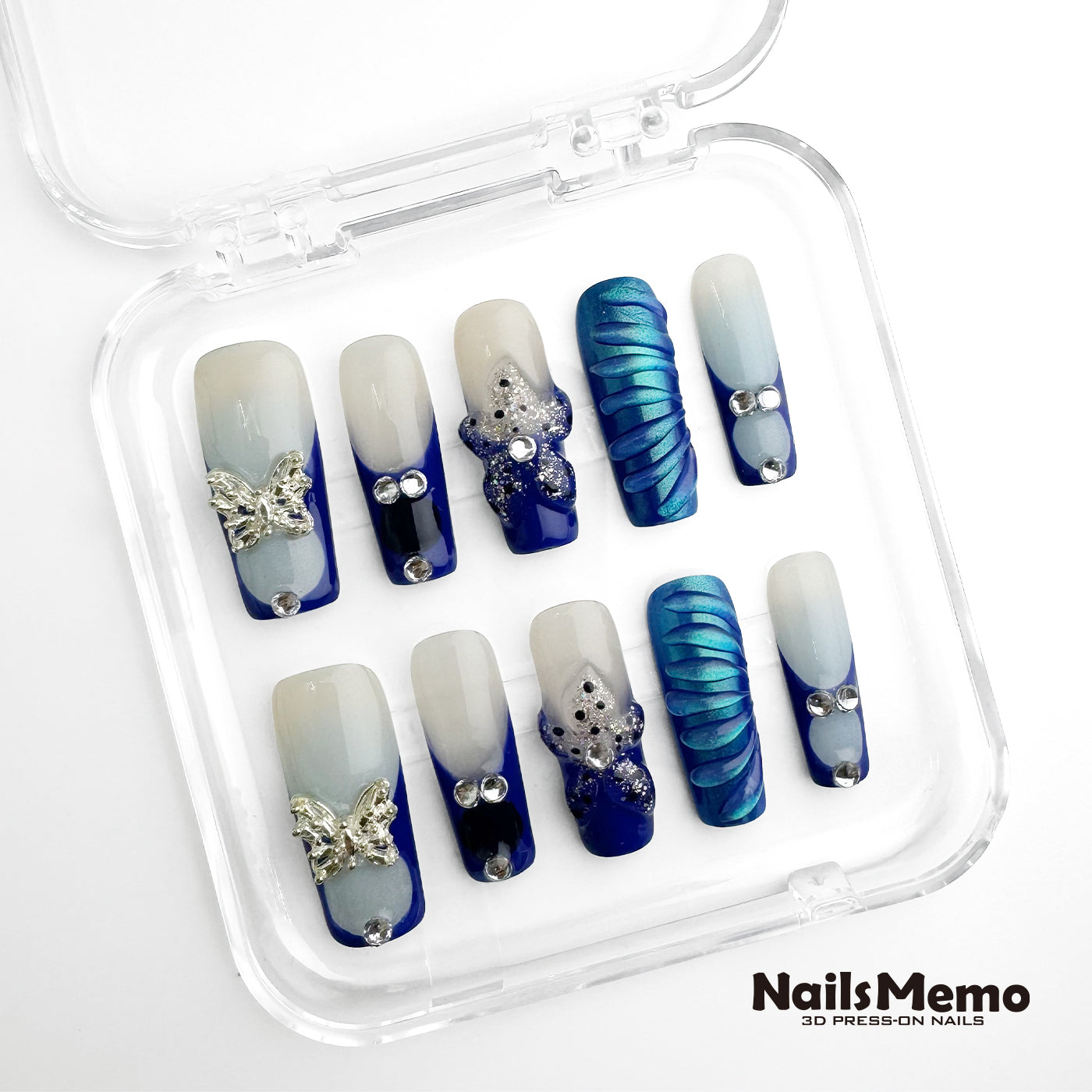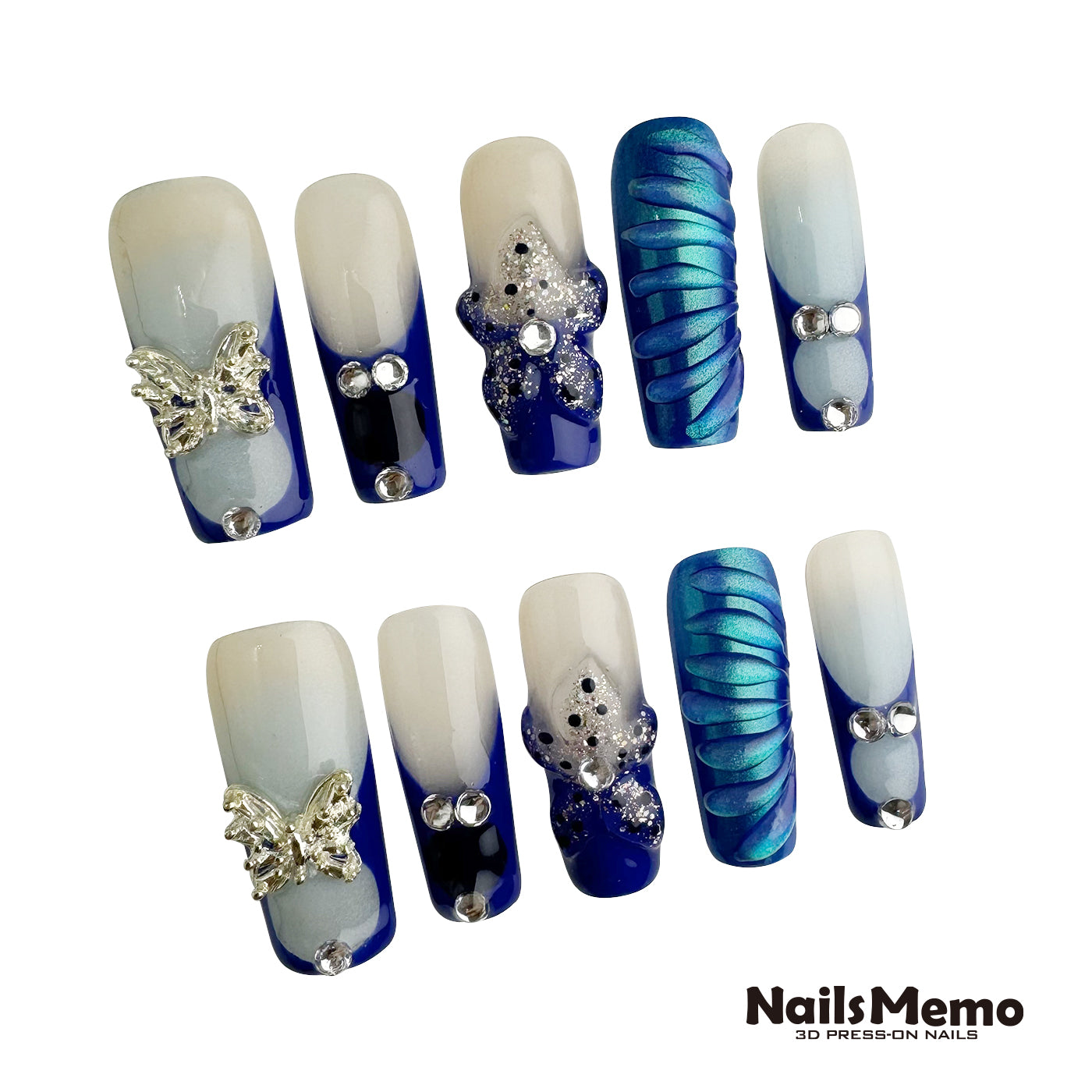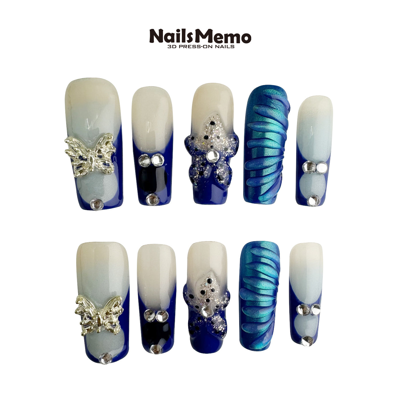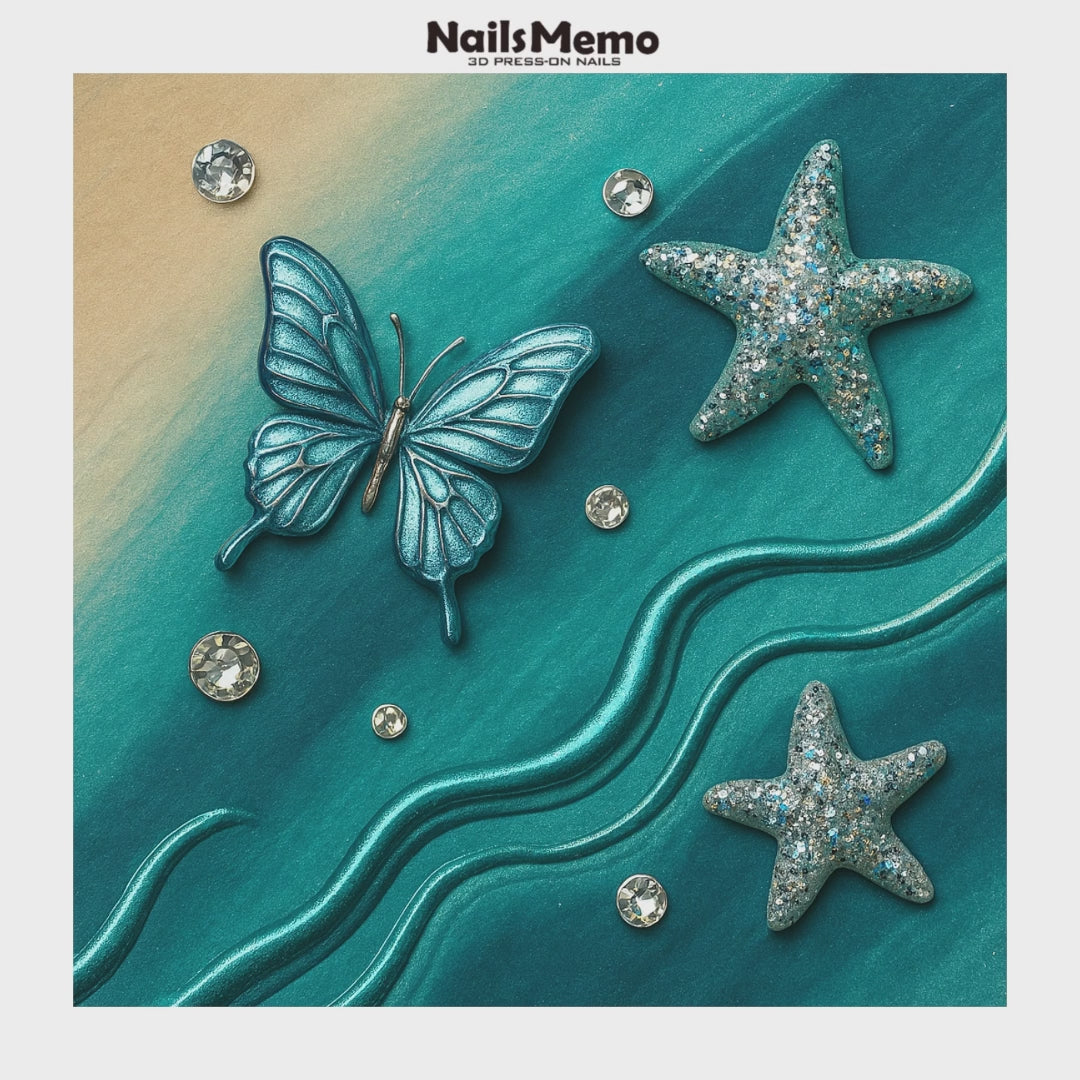 Dive into a dreamlike seascape with Ocean Mirage, where cerulean gradients meet shimmering depths. This set features a mesmerizing fusion of iridescent aqua, deep navy, and soft sand-toned gradients, brought to life with sculpted 3D butterflies and starfish encrusted in celestial glitter. Metallic teal swirls evoke underwater currents, while silver accents glisten like sunlit ripples. A balance of elegance and fantasy, this set captures the fleeting magic of an ocean mirage.