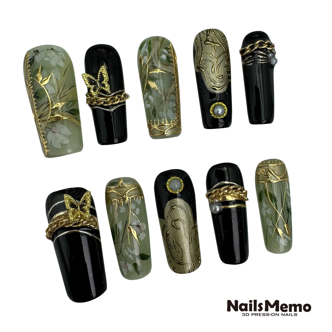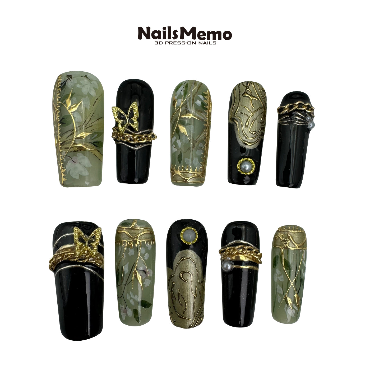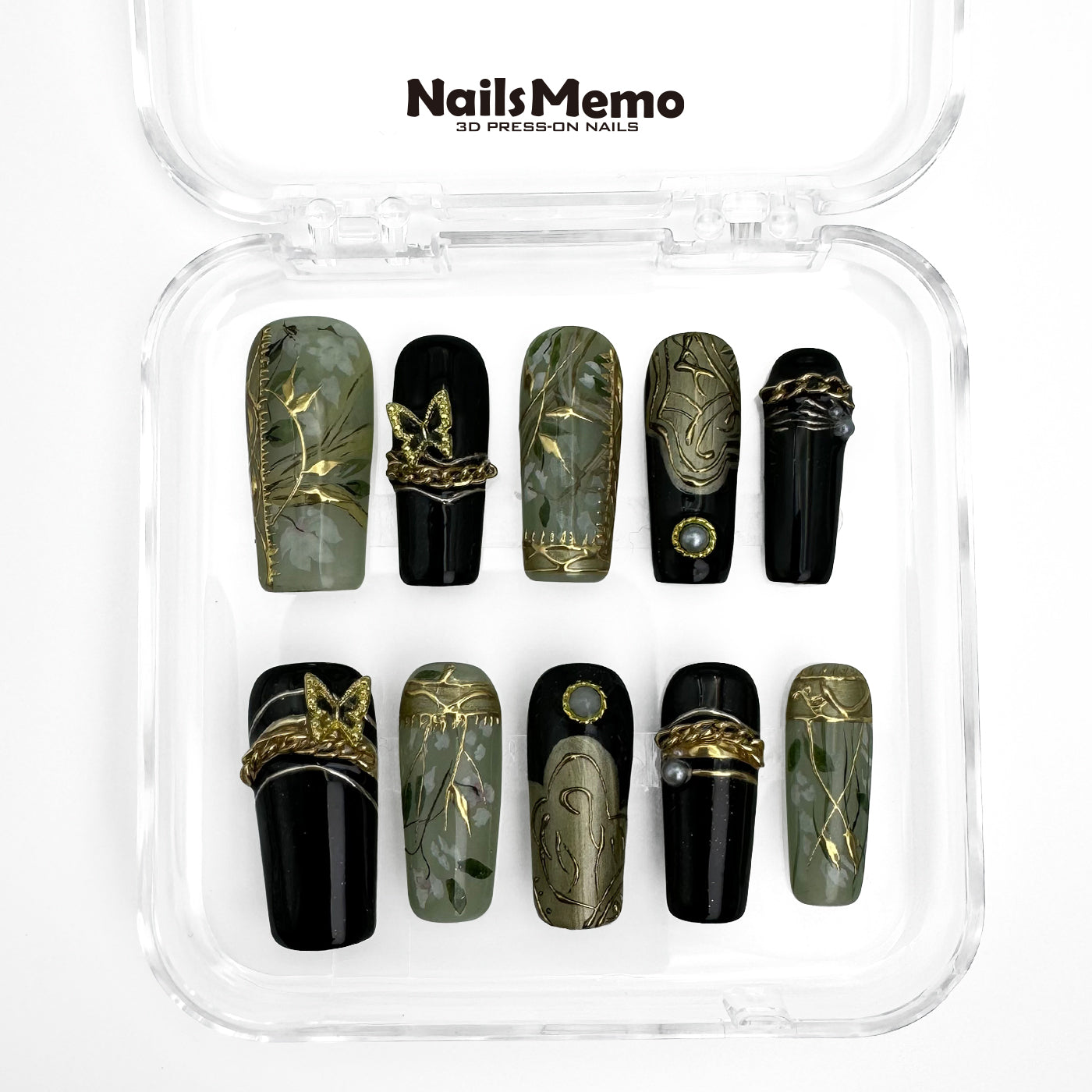 NailsMemo Oriental Grove is from The 2025 SUPERNATURAL Collection. A hand-painted elegant design inspired by ancient gardens under moonlit skies.