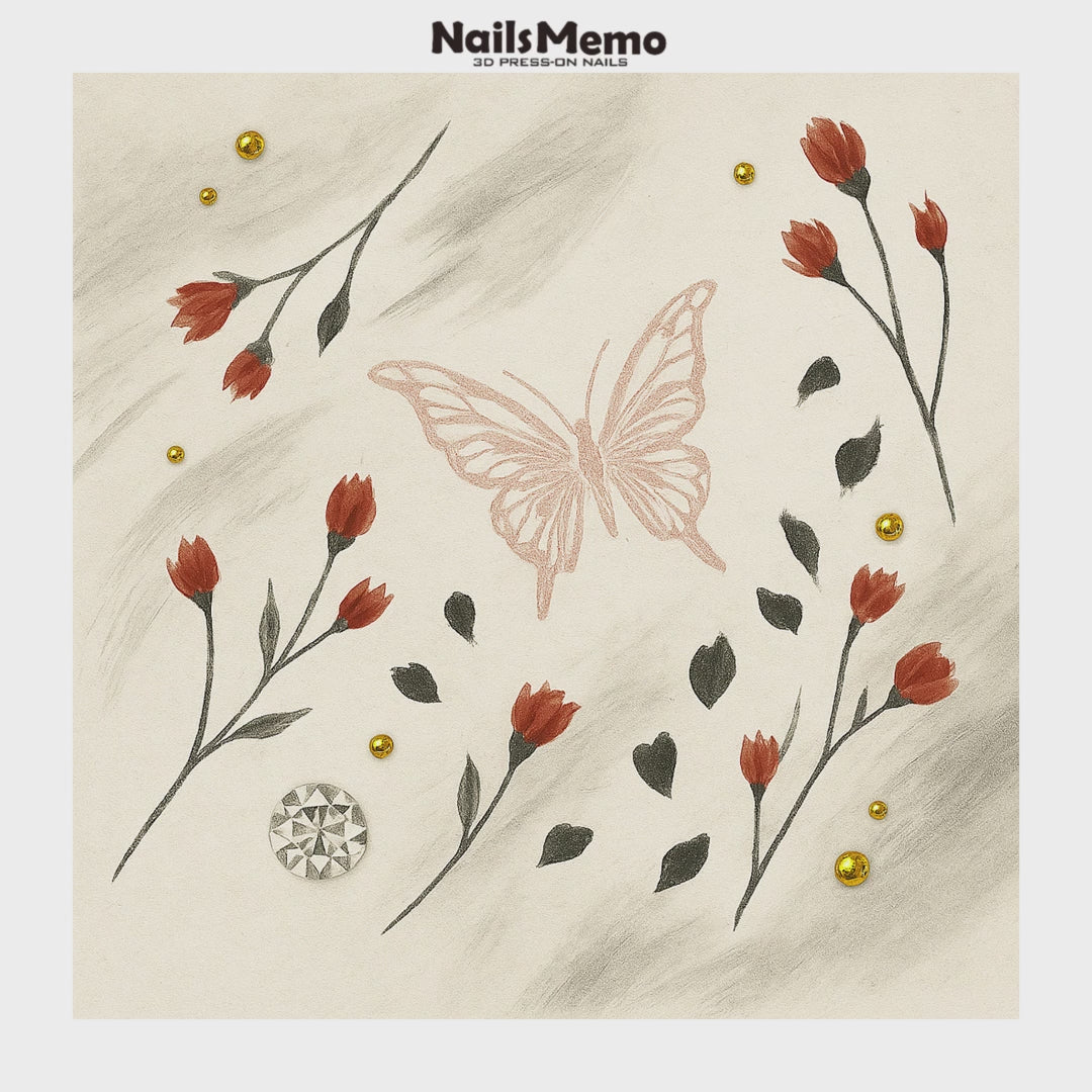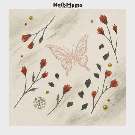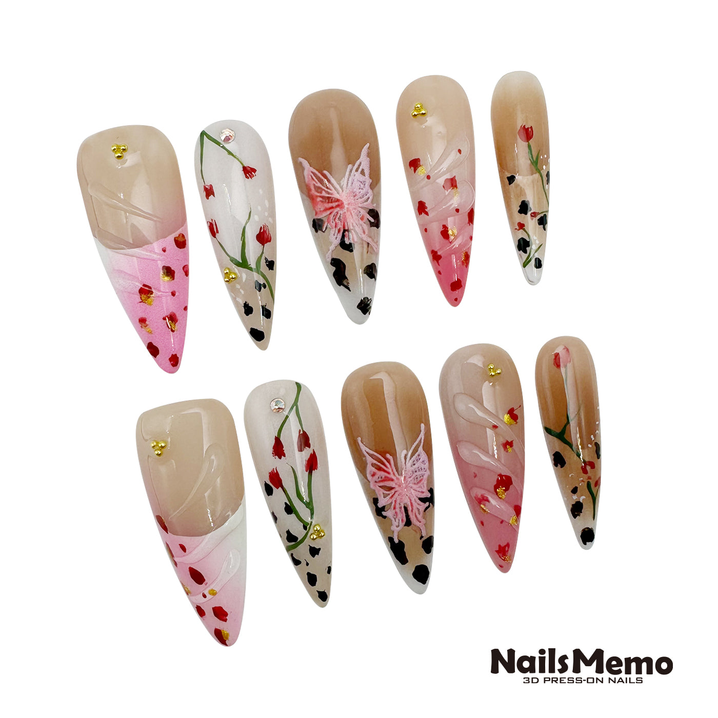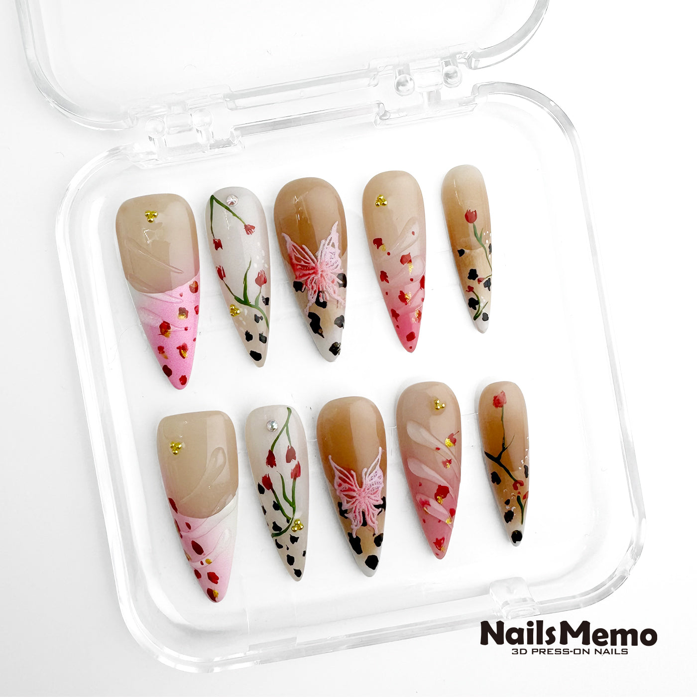 NailsMemo Painted Petals is from The 2025 SUPERNATURAL Collection. A poetic blend of soft blush pinks and warm beige, Painted Petals features swirling tulip-like strokes, translucent ripple textures, and faint leopard undertones layered with crystal embellishments. Like a faded memory painted in the air, this set captures a quiet strength wrapped in gentle beauty — mysterious, elegant, and full of longing.