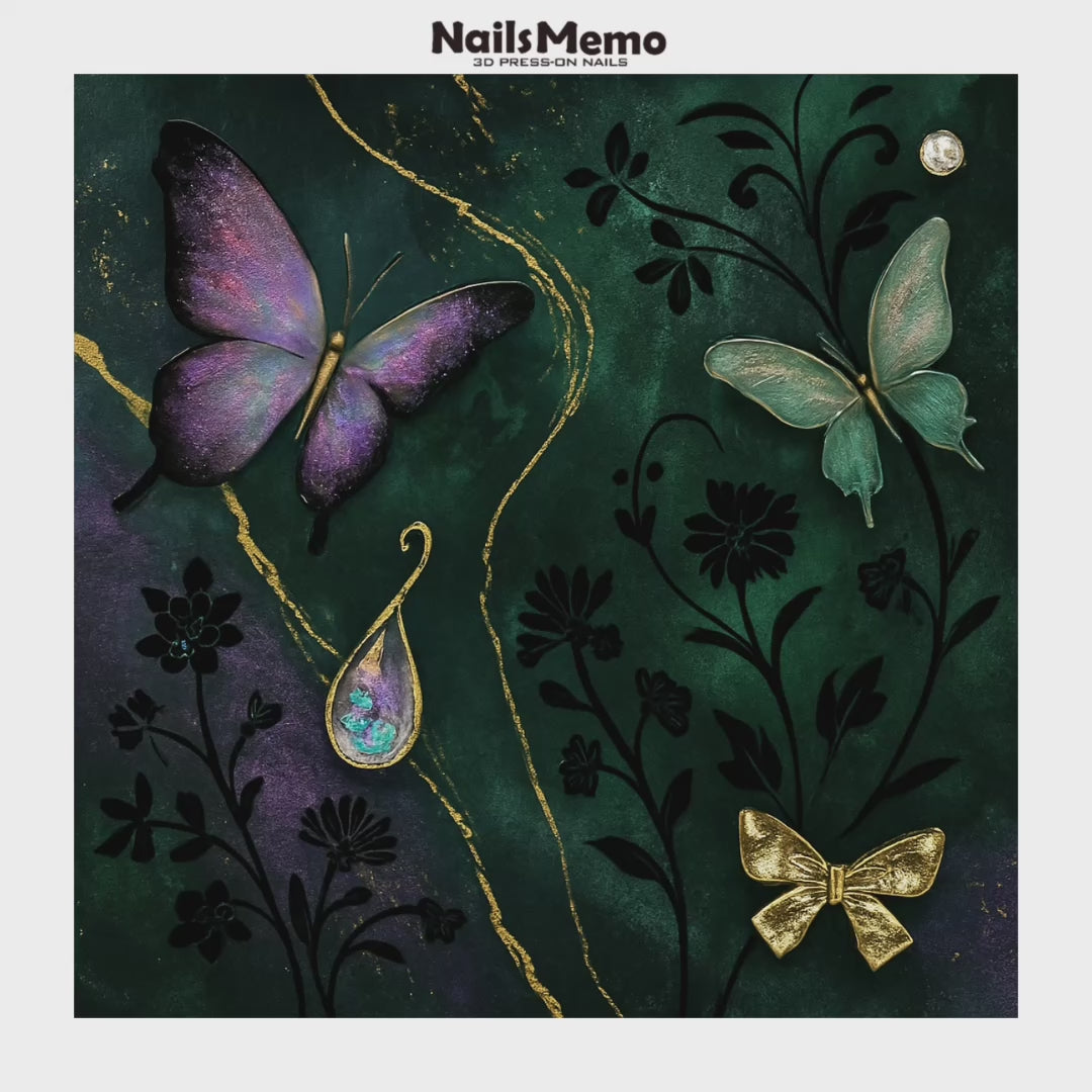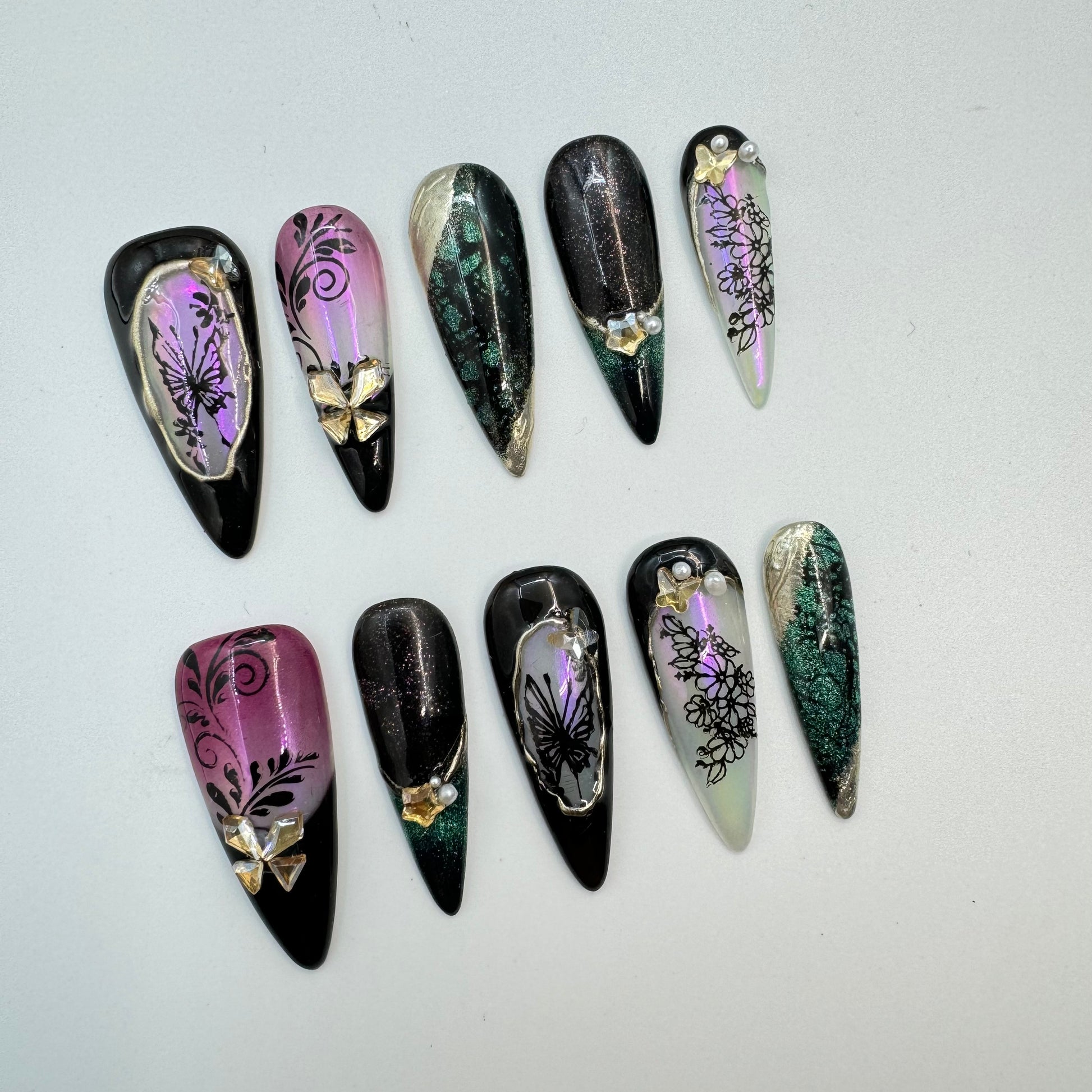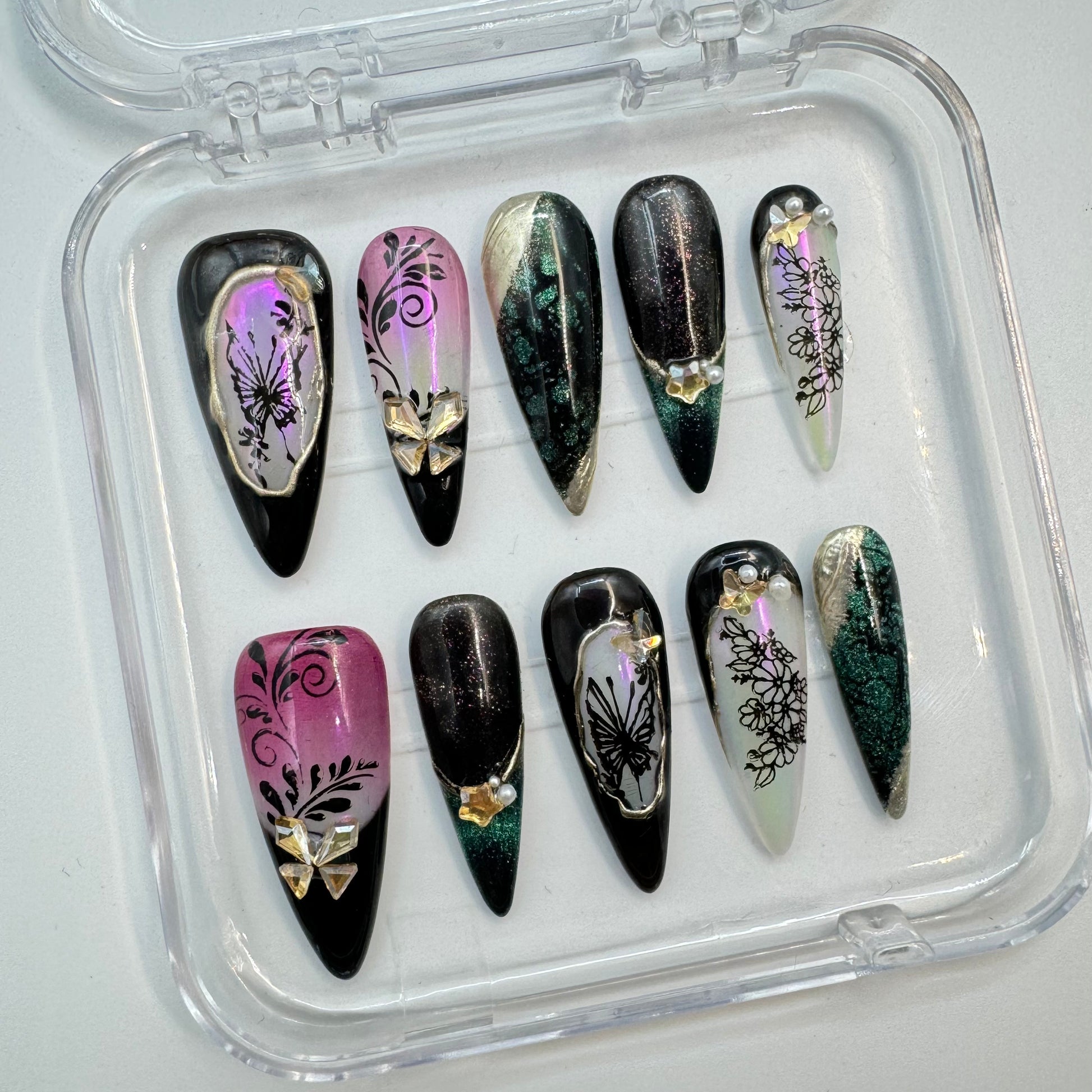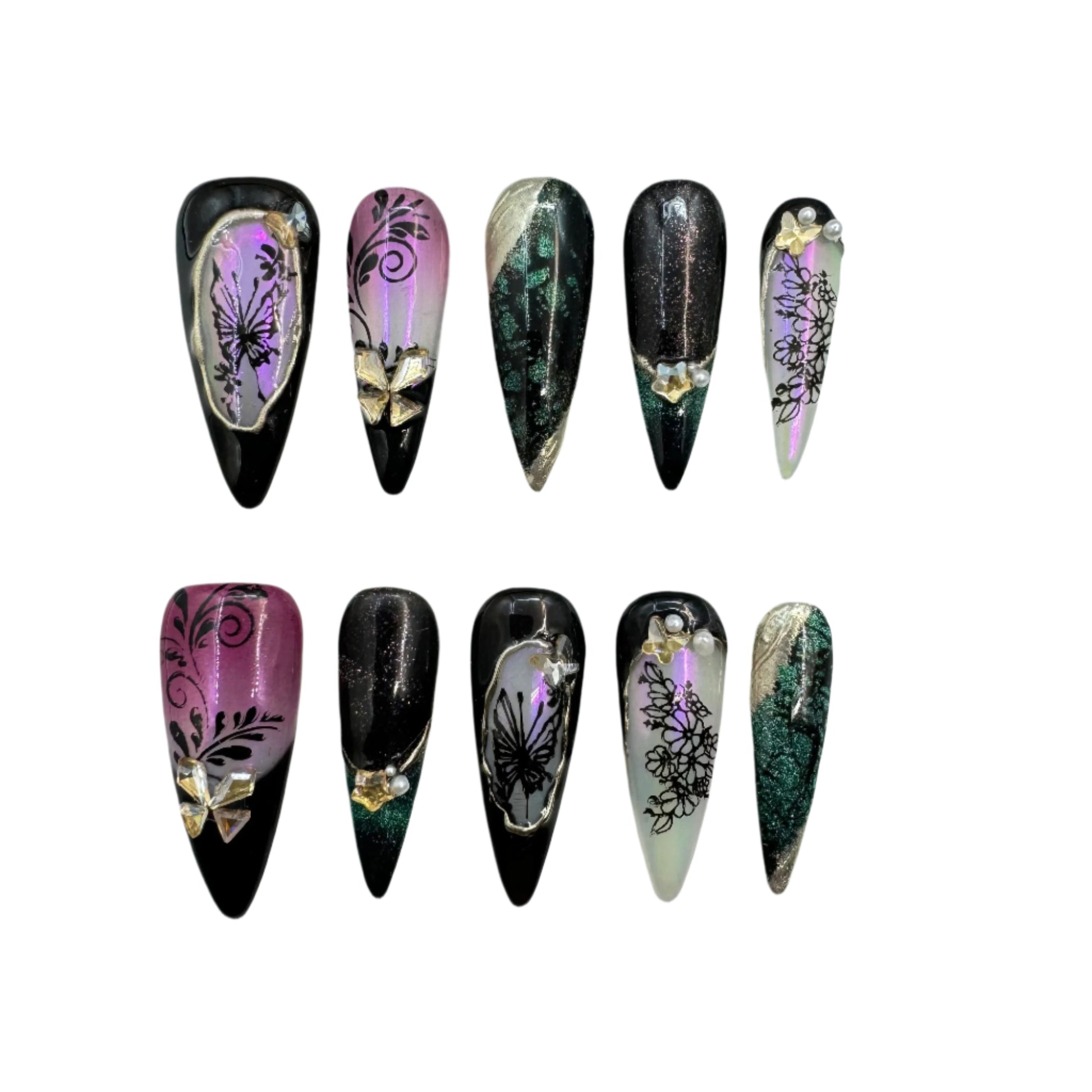 A poetic fusion of darkness and shimmer, Phantom Bloom pairs iridescent pink and green chrome with black and gold accents. Detailed with ghostly floral etchings, 3D butterflies, translucent gems, and golden foil edging, each nail evokes a mysterious garden suspended in twilight.