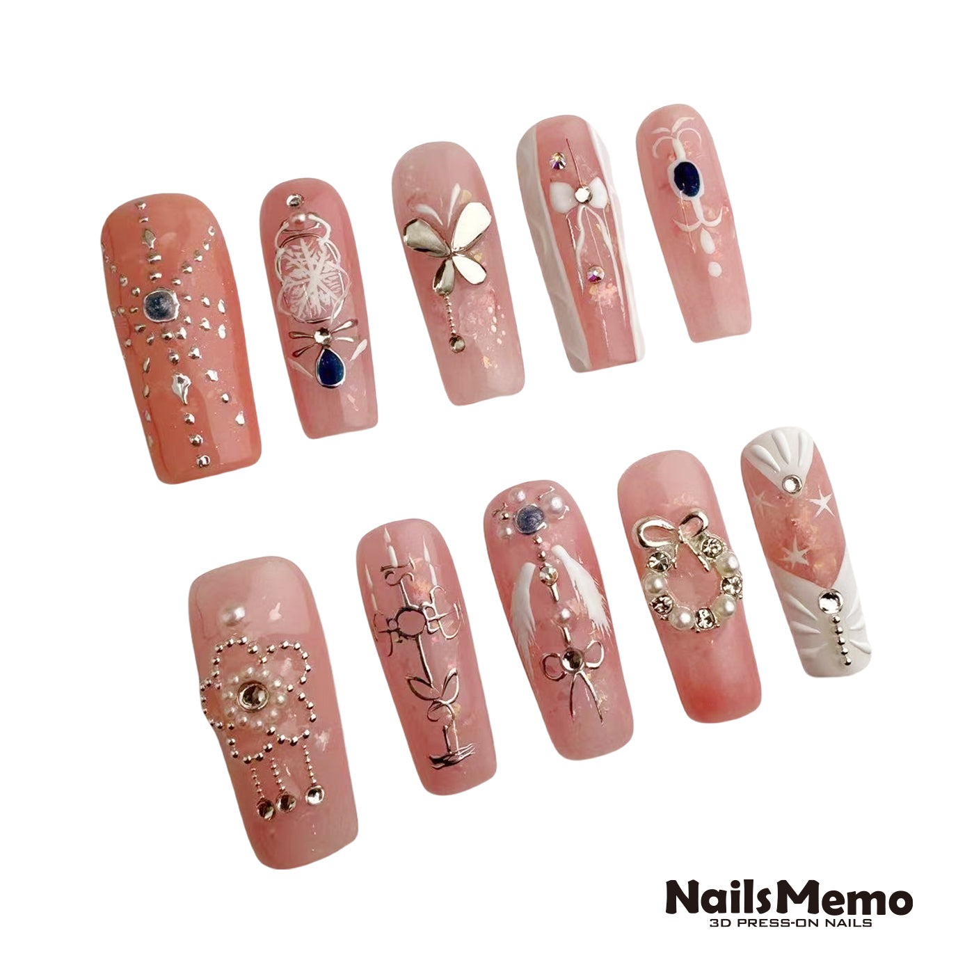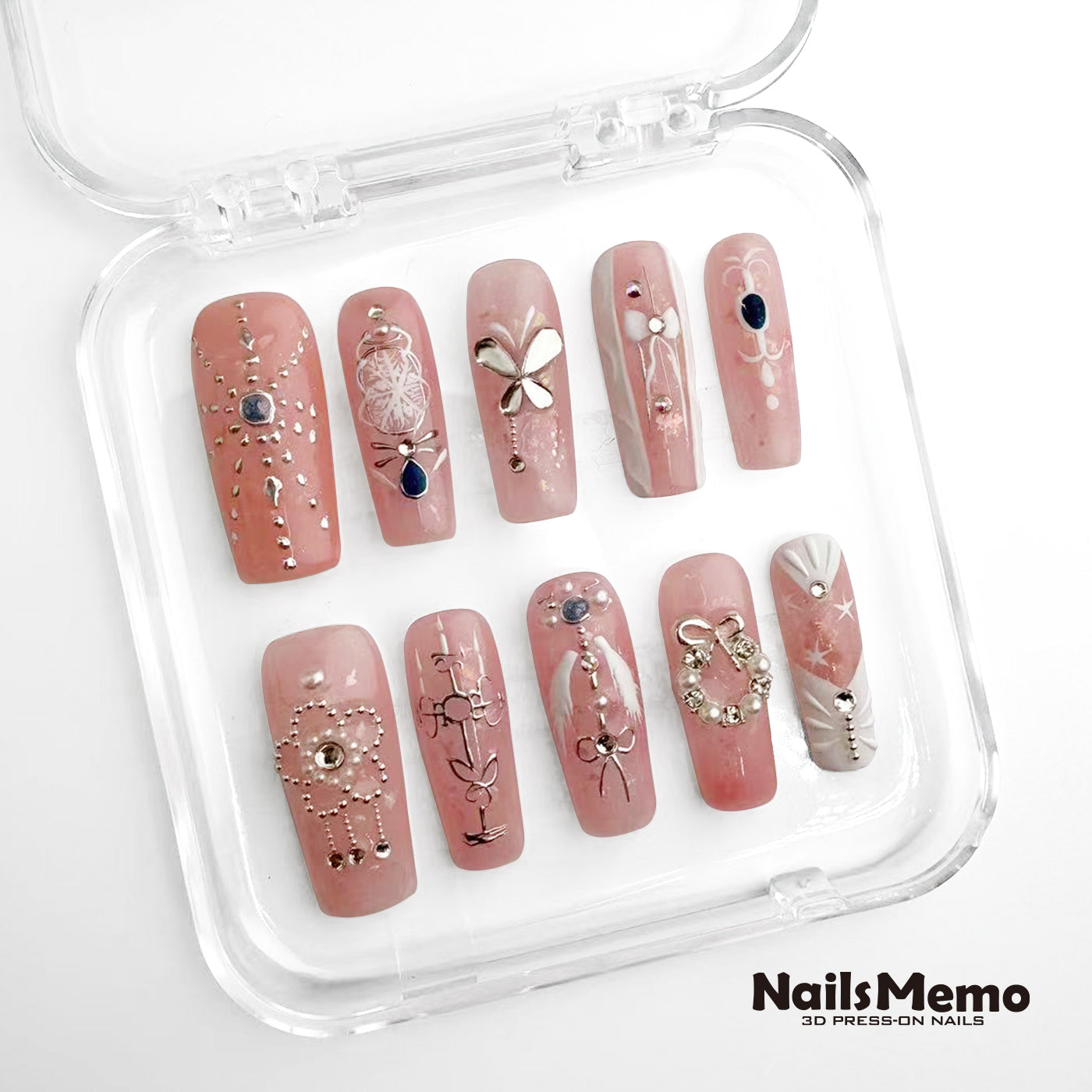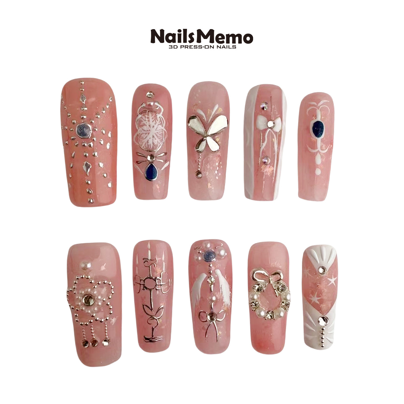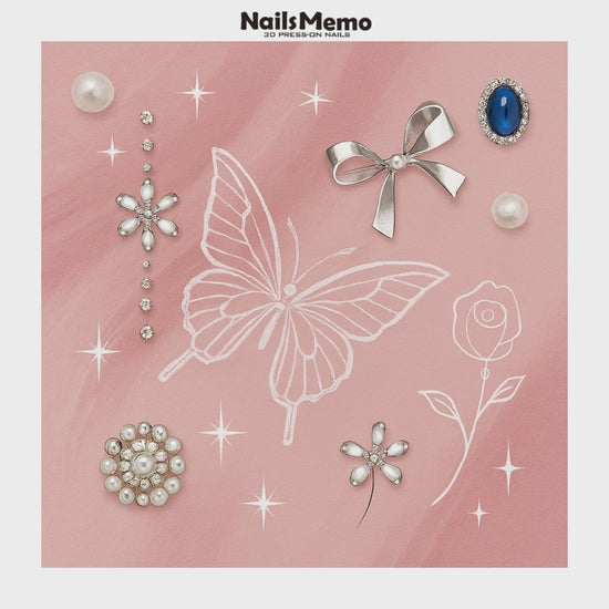 NailsMemo Pink Riddle is a soft yet striking 10-piece press-on nail set, layered with blush pink gel, crystal-studded floral accents, pearlescent details, and metallic silver charms. It’s the perfect contradiction — gentle and bold, classic and contemporary. Each nail feels like a secret waiting to be unraveled, with ribbons, butterflies, and sculpted silhouettes telling a different part of the story.