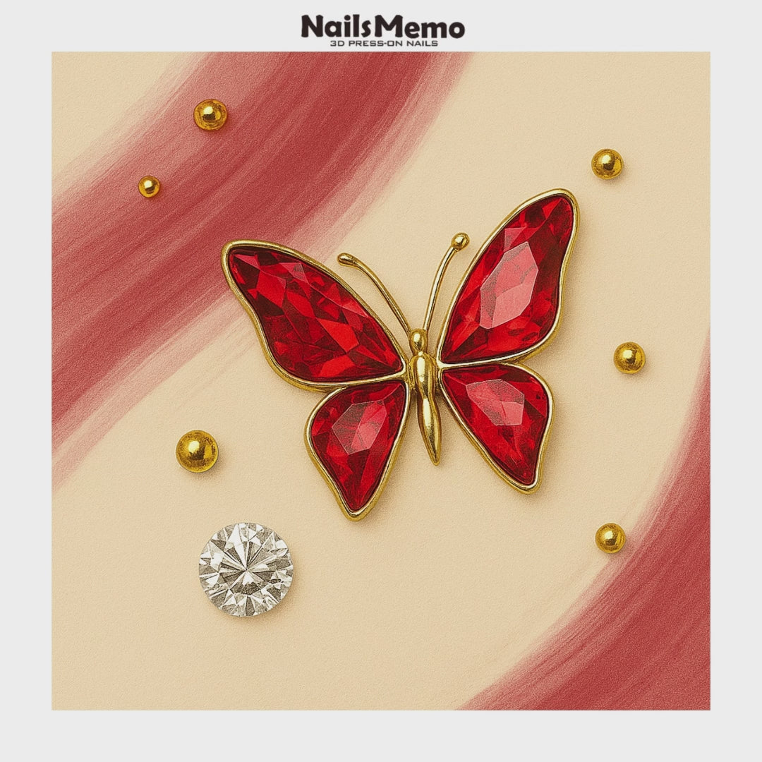 Scarlet Glimmer is a fiery celebration of elegance and passion. The nude-to-pearl ombré base offers a subtle canvas for bold red butterfly embellishments, adorned with gem-like crystals and golden studs that catch the light with every move. A striking crimson curve traces each nail like a ribbon of confidence—flirty, fearless, and unforgettable. This set is for the ones who dare to glow with unapologetic charm.