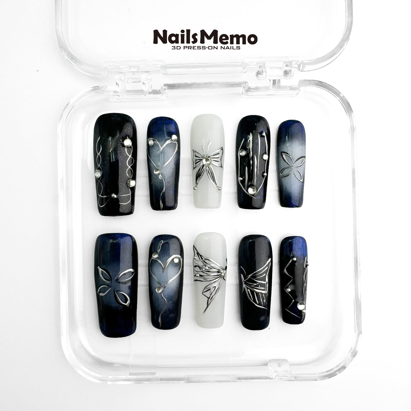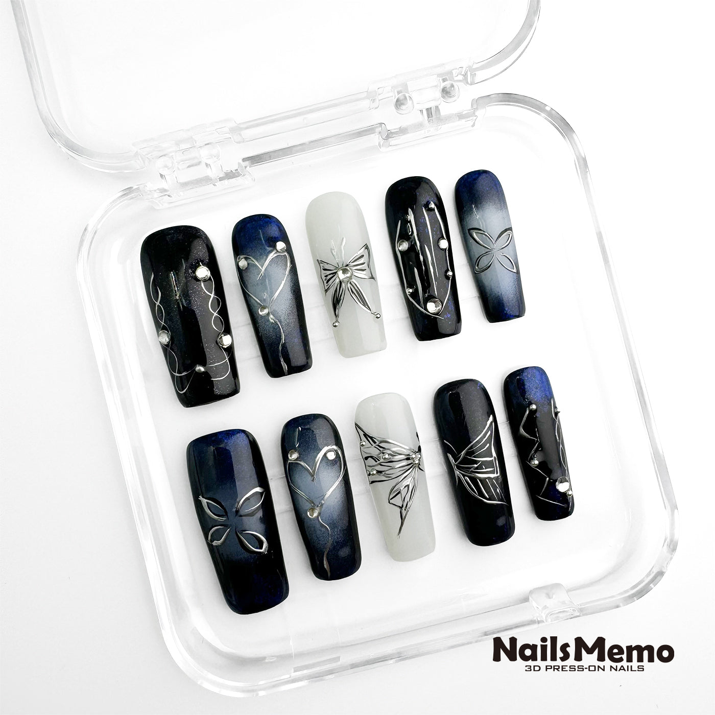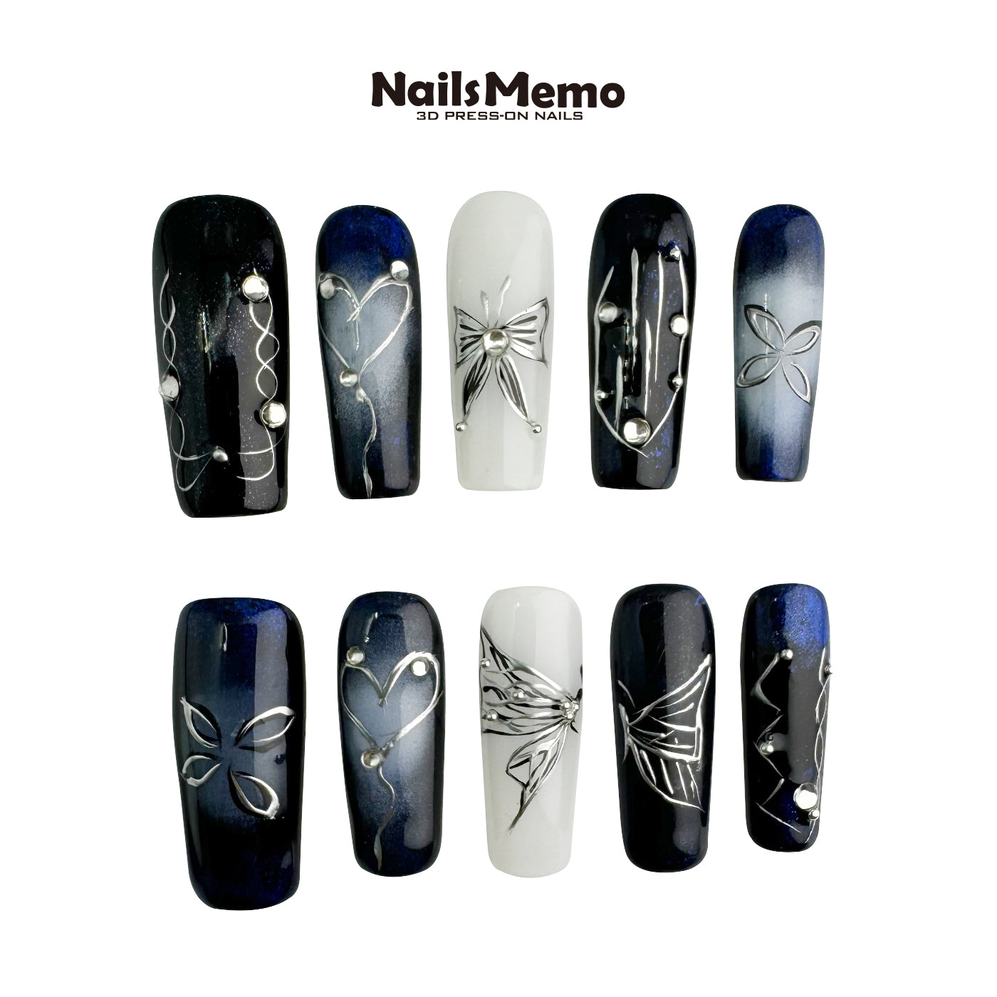 A celestial statement, Starlaced fuses midnight hues with chrome-silver wire art to sculpt delicate butterflies, hearts, bows, and vines. The designs mimic constellations across a starlit sky, each embellishment evoking the quiet grace of night. A contrast of dark galaxy gradients and pure white bases adds a graphic pop to this set’s visual rhythm. Shimmering yet structured, these nails make the ethereal tangible.