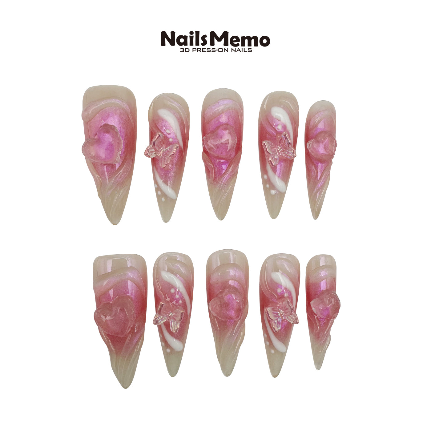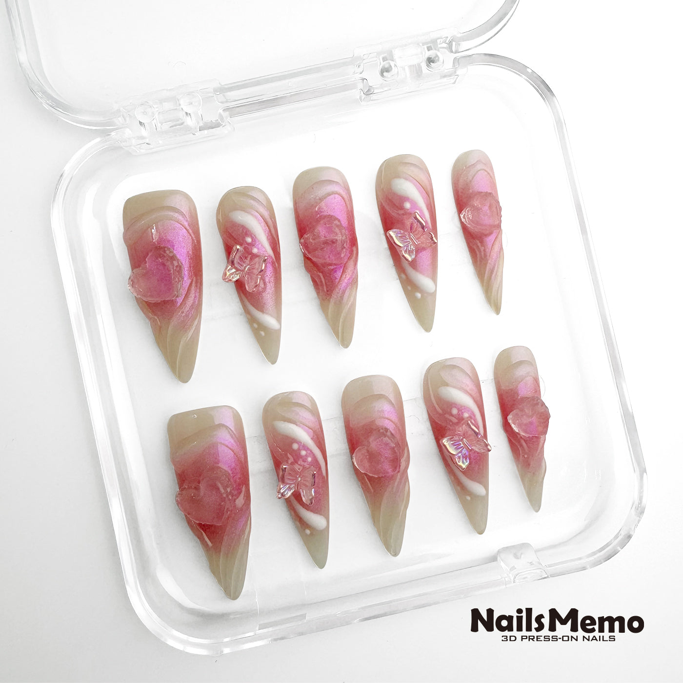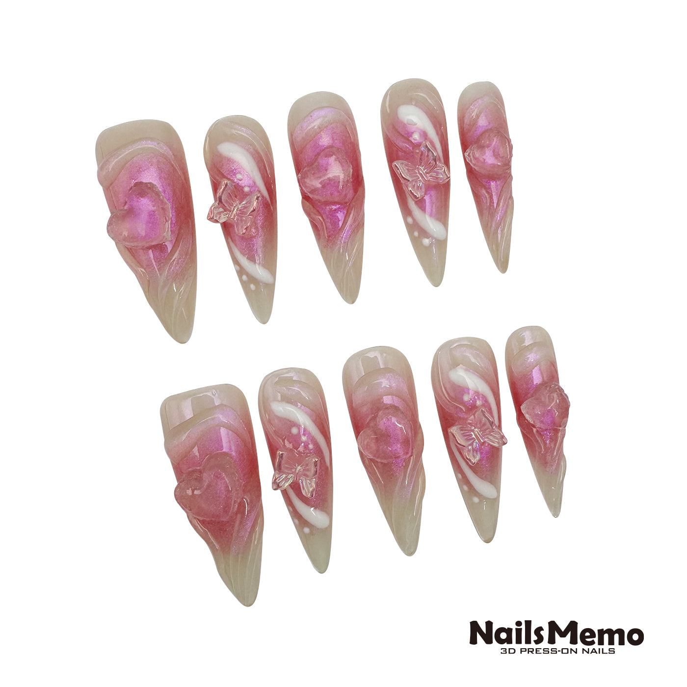 Sugar Flare is an unapologetically bold yet sweet design, built on glossy fuchsia-pink shimmer and swirling milky white strokes. Finished with translucent hearts and butterfly sculptures, it feels like a sugar rush frozen in time. This sculptural nail art is for those who like their sweetness with a spark — playful, polished, and impossible to ignore.
