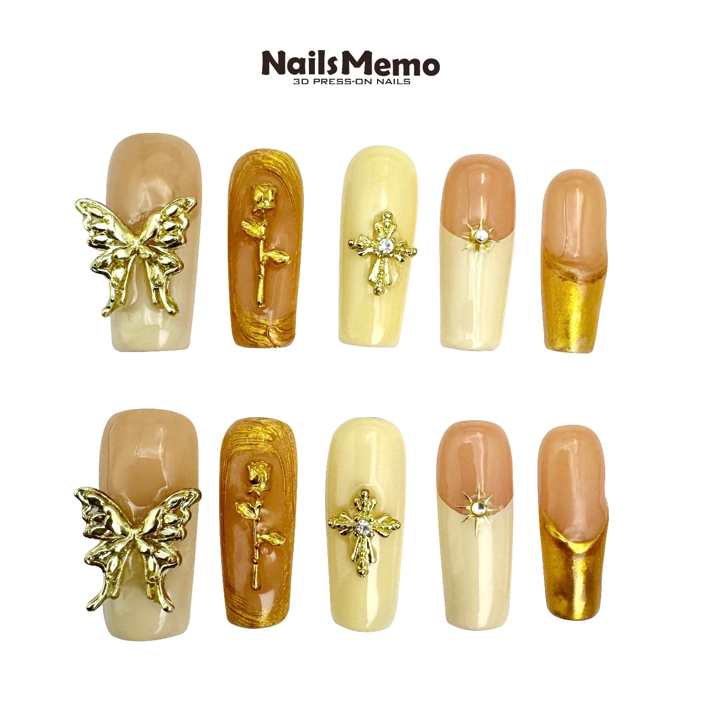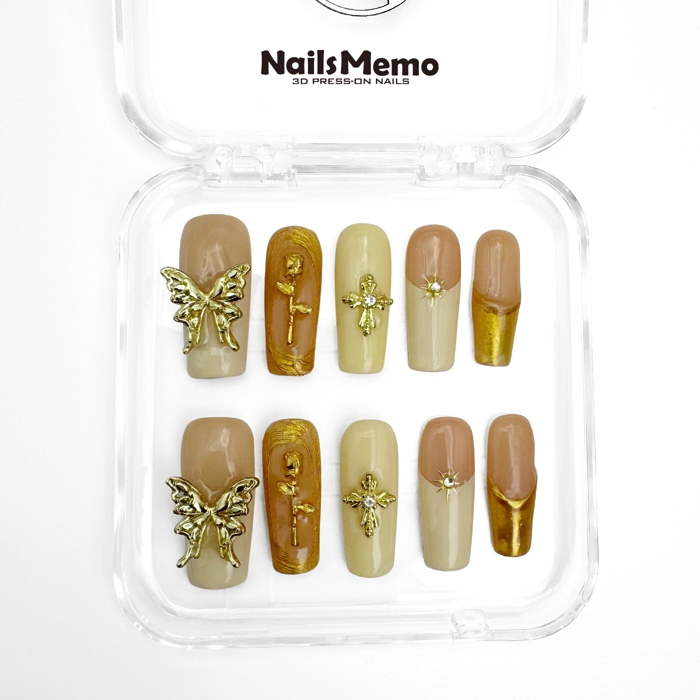 A radiant reinterpretation of the beloved Sunlit Trace, this long square version enhances the glow with a confident silhouette. The soft almond beige base pairs effortlessly with golden rose embossments, star-like studs, and metallic dipped tips, while the butterfly centerpiece gently evokes nature’s touch. It's elegance elongated, capturing the warmth of a golden hour in every fingertip.