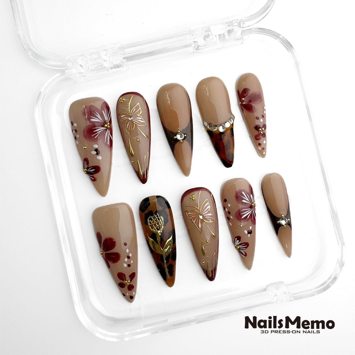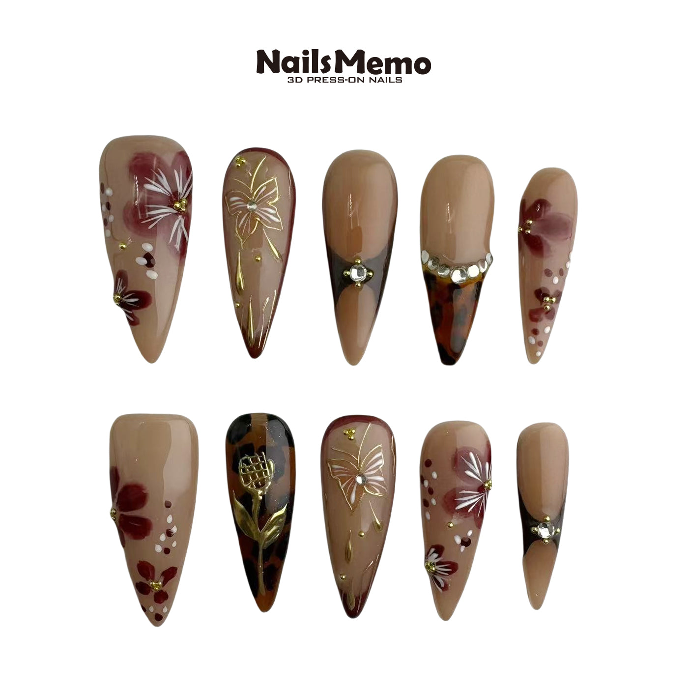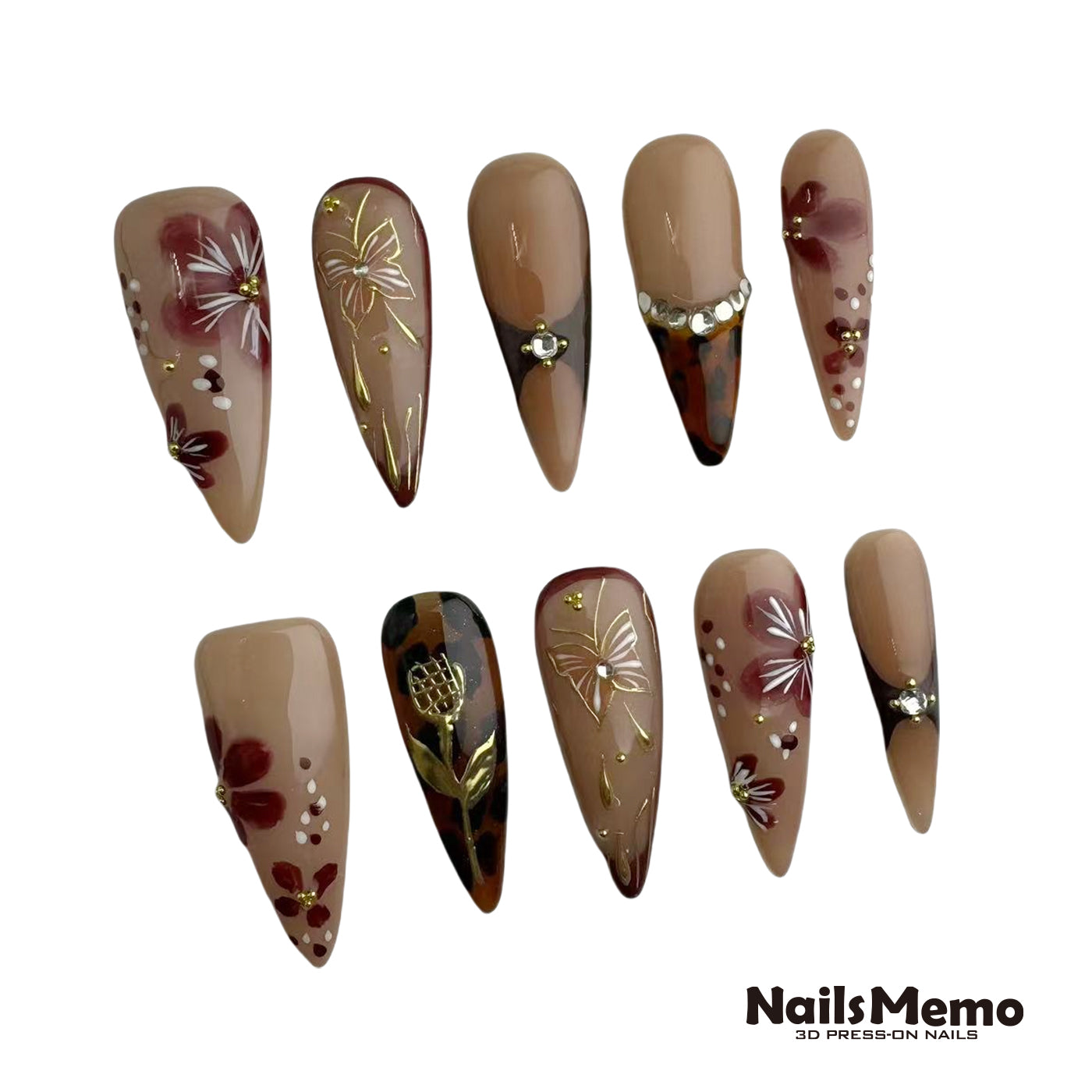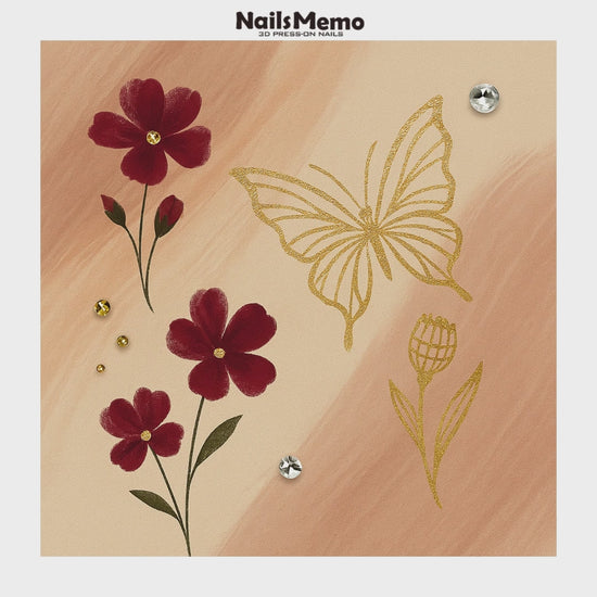 A rich blend of earthy terracotta, soft nude, and maroon tones come together in Terracotta Petals, a design that fuses delicate femininity with a grounded, autumnal elegance. Golden butterflies, pressed flower motifs, tortoiseshell accents, and gem-like droplets add textural contrast and timeless detail. The palette evokes the golden hour of a late summer evening—warm, glowing, and peaceful.